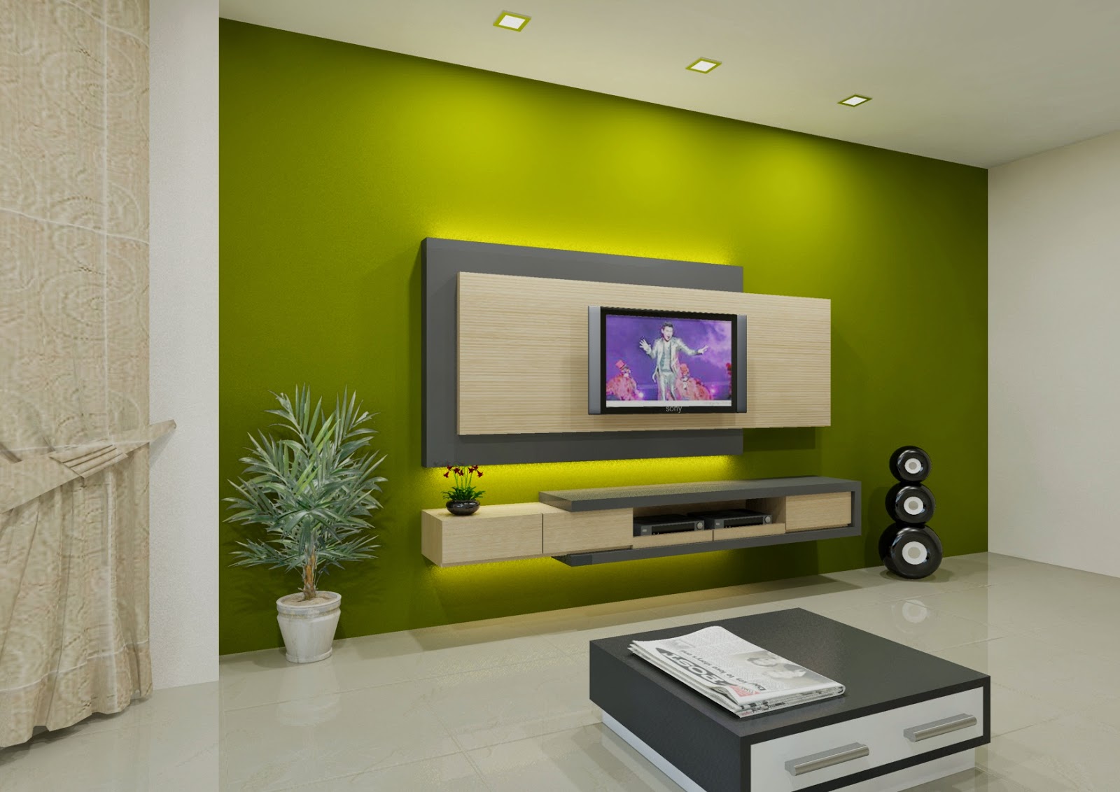 Настенный и компактный телевизионный шкаф может быть встроен в соответствующую стену, что не только сэкономит место на полу, но и его будет легко чистить и чистить. может обеспечить комфортный просмотр. В дополнение к этому создание полок и открытых ниш в шкафу для телевизора создаст эпический декор и может использоваться для демонстрации книг, фотографий и произведений искусства. Ниши можно украсить галькой и натуральными растениями.