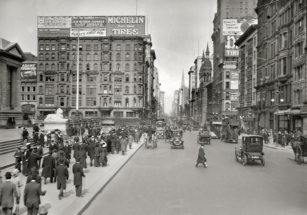 Тинкер смотрит через плечо в камеру, пока привязывает коробку к тележке, уже загруженной кастрюлями, щетками, тазами и т. д. Юнион-сквер, Манхэттен. Глядя на статую Лафайета сзади и слева, магазин С. Кляйна, банк, отель и Консолидейтед Эдисон Билдинг, дальше. Мэдисон-сквер, вид на северо-восток, Манхэттен. Полицейский стоит перед статуей Сьюарда, чистильщик обуви отдыхает на перилах справа, здание Metropolitan Life возвышается над парком. Геральд-сквер, 34-я улица и Бродвей, Манхэттен. Глядя вниз на оживленный перекресток, люди переходят дорогу, автобусы, грузовики, такси, другие автомобили, вход в Macy’s едва виден с профсоюзным пикетом впереди. Аптека Уилана, 44-я улица и Восьмая авеню, Манхэттен. Мужчина ждет покупателя на заднем плане, витрины с электроприборами, часами и выставкой конфет ко Дню святого Валентина. Уиллоу и Тополь-стрит. Вагон для прачечной, автомобили, вдоль наклонной улицы с рядными домами, горизонт Манхэттена виден над зданиями в конце улицы. Уолл-стрит, с крыши здания Irving Trust Co.