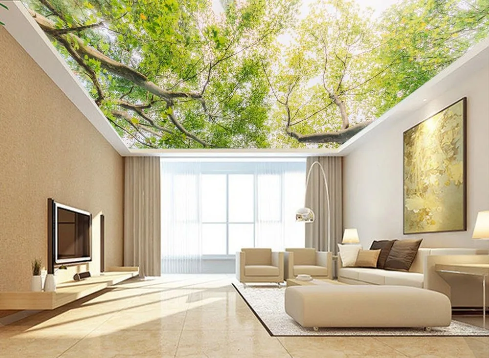 Выбирая фотопечать на потолке для зала, важно учитывать общий стиль помещения и используемые в обстановке оттенки. Для современных интерьеров можно использовать изображение космоса, а в роскошных гостиных изюминкой станет старинная фреска.